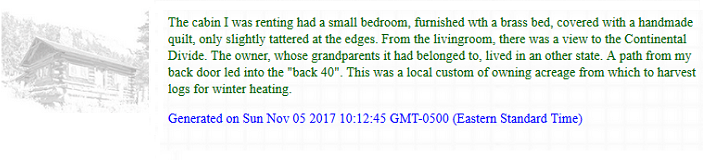 Each module consists of an image that keys it, phrases and sentences, and code that generates the stored text at random. So far, I am happy with how the generated text is working, but there are issues with how the modules will eventually interweave. Additionally, although, my decision to write Diana's voice as notebook entries that are not writer's voice-embellished gives a certain energy to the work, this needs to be somewhat improved.
