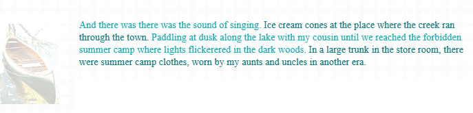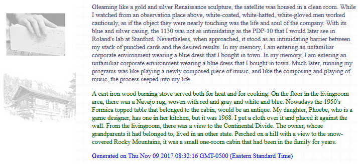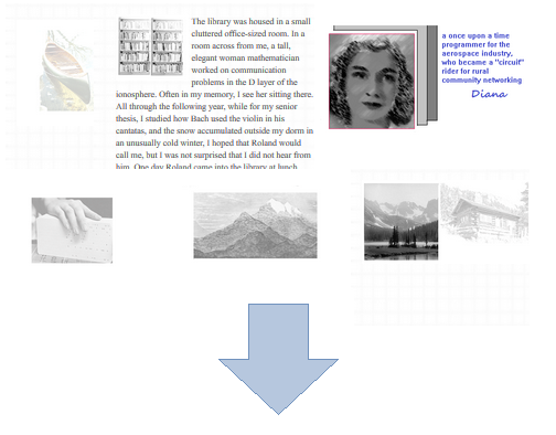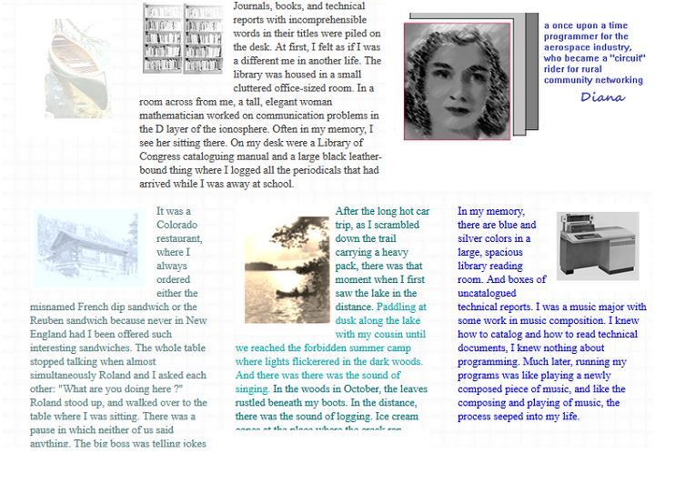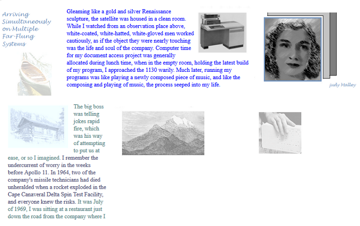 Although I used images as icons to key text in maps; in my card catalog The Woodpile (1979); in the early web version of the Blue Notebook (Uncle Roger File 2); as well as in A Party at Silver Beach, the use of images in my work has not been predominant since the days of making maps and "card catalog"-based narratives. Thus, I would like to also call attention to JR Carpenter's algorithmic electronic manuscripts, created with integrated images and generative text -- as well as to Deena Larsen's combinations of images and text in Marble Springs -- as being innovative examples of the use of images in conjunction with story-bearing text [..] In the case of Arriving Simultaneously, because the text is generated from different modules, ultimately, the images are important in situating the reader within fluctuating time-frames in the narrator's life. In order that they be meaning-laden but not didactic, many of the images are designed to fade unobtrusively into the background.