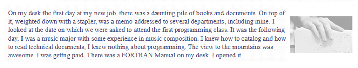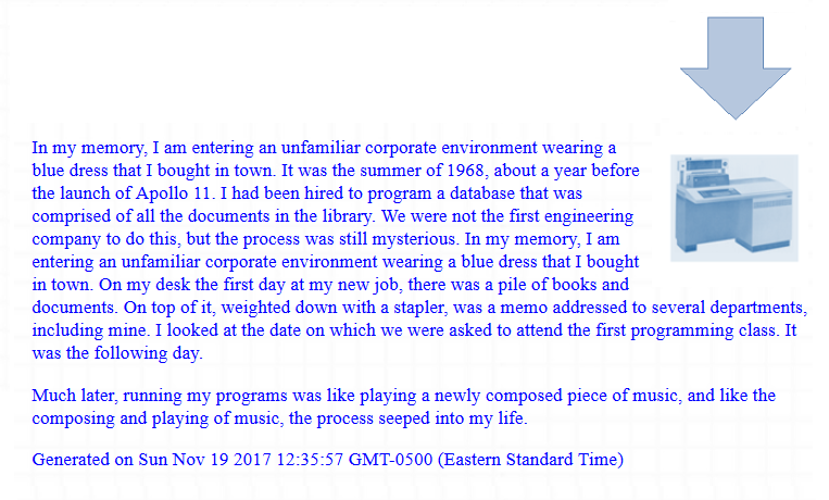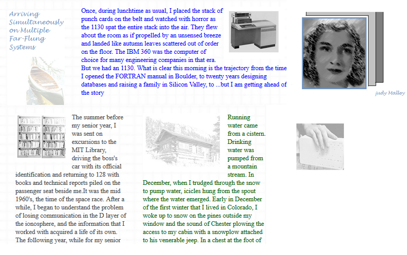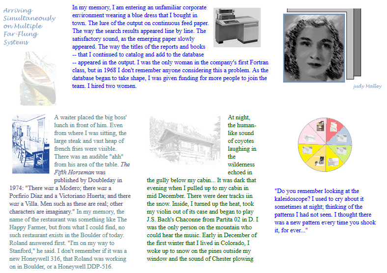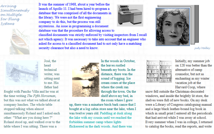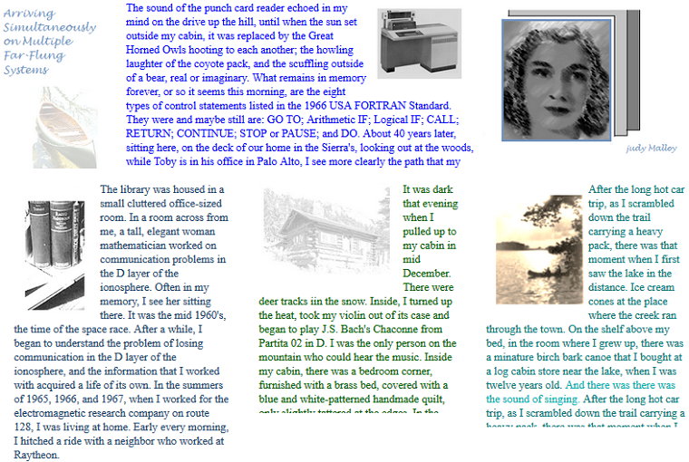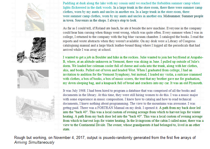 A rriving Simultaneously on Multiple Far-Flung Systems is a generative electronic manuscript. The first "page" in this work -- the page I am working on now -- is composed with six arrays and a few associated unconventionally-nested arrays. As I, the writer, mine my memories to convey the experience of the computerization of a Colorado aerospace technical library in the late 1960's, the reader of this work experiences the spare, compressed memories that would be expected from a narrator, who is looking at her life many years later. We don't remember sequentially. I repeat. We use the affordances of electronic literature to tell stories differently. As with any form of writing, the whole takes a while to come together.