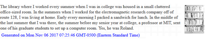 As I wrote the words that lead off this entry, something I should have realized long ago was apparent: it is not only the coding but also the process of adding new data, running the program, and adding new data that are the heart of much of my work. All of these things were influenced by my work at Ball Aerospace. Thus, in surprising ways, corporate environments have incubated electronic literature. I am thinking also of James Tenney's residency at Bell labs from 1961-1964 and his role in fostering Fluxus generative Poetry and of Bolt Beranek and Newman (BBN) programmer Will Crowther, who developed Adventure in Fortran on BBN's PDP-10 in the 1970's.