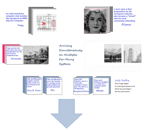 F or Arriving Simultaneously, I could have created a woman mathematician. That was my original intention, but the details of the life of a mathematician were not in my memory. Instead, Diana is a music major [I was not a music major, but I played the violin and was familiar with this territory], an early information retrieval programmer for a NASA contractor (at a time when information retrieval systems were not well developed and documented), a Silicon Valley-based database designer, and eventually a core figure in computer-mediated community networking.
