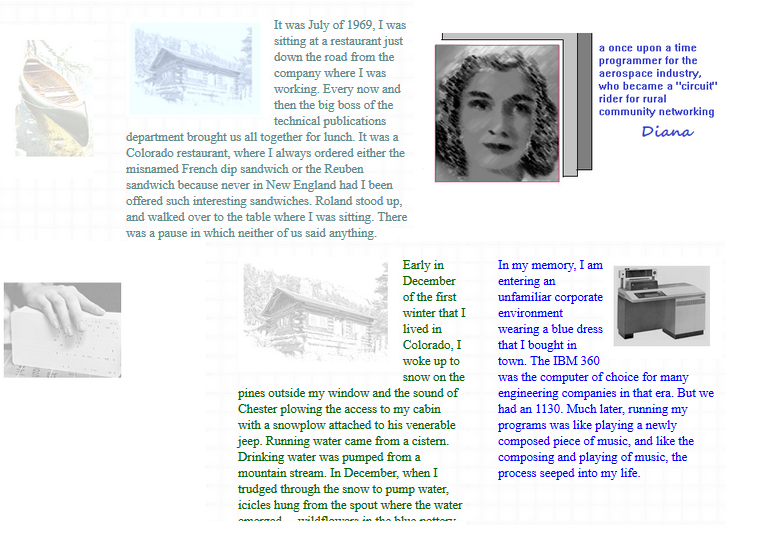 1. diana_begin.html. The initial top interface page is composed of active spaces that each lead to a different opening page; each reader choice sets the stage for a different part of the story; eventually they will intertwine. Some of the text that the top page calls will briefly appear on the top page itself. Other text will appear on separate pages. The initial top page is currently in the throes of serious design and image issues, but the idea is working.